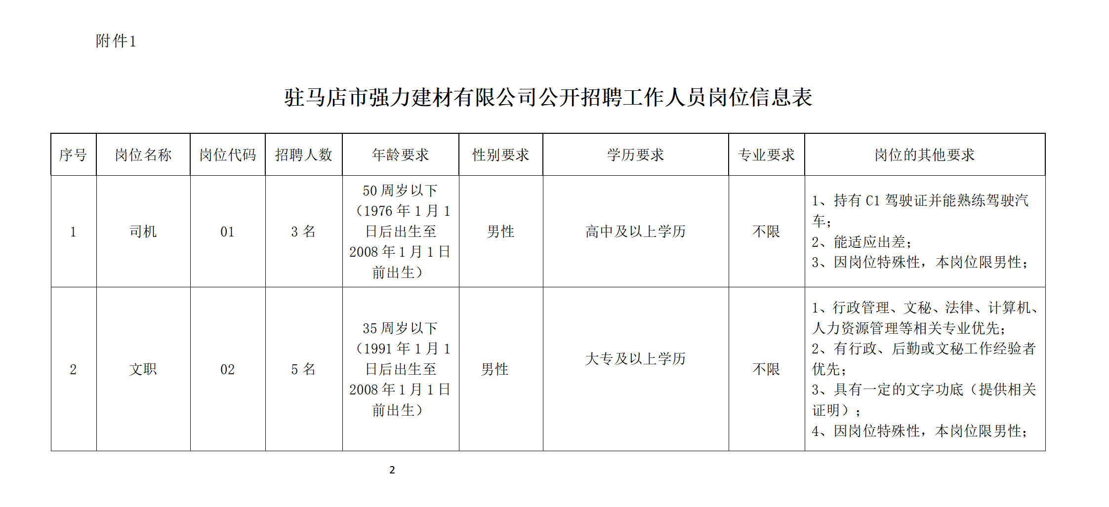 附件1:驻马店市强力建材有限公司公开招聘工作人员岗位信息表