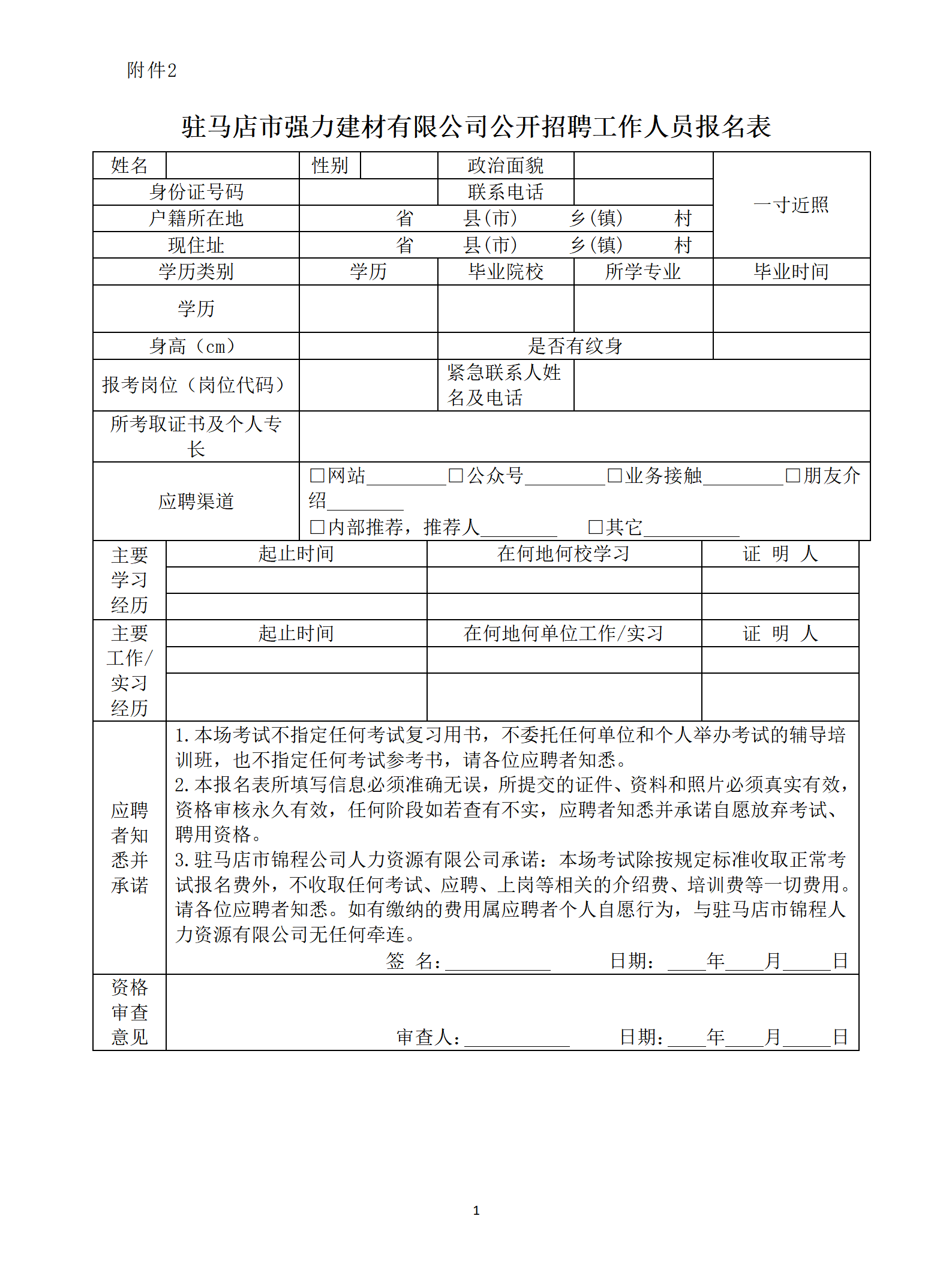 附件2:驻马店市强力建材有限公开招聘工作人员报名表