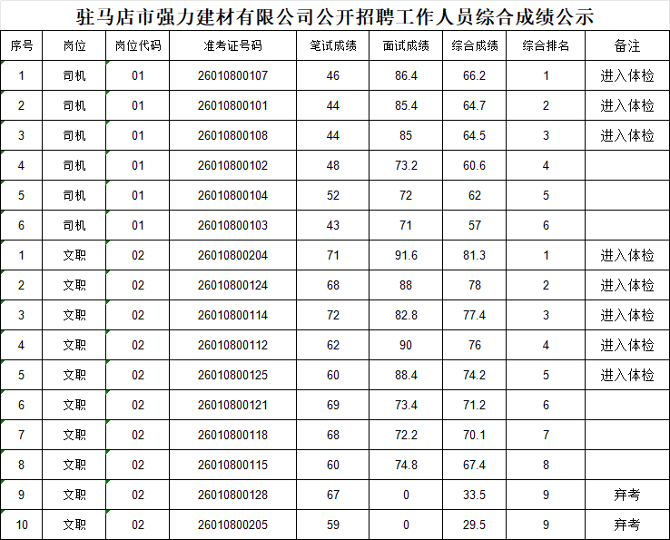 驻马店市强力建材有限公司公开招聘工作人员综合成绩公示