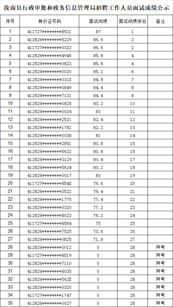 汝南县行政审批和政务信息管理局招聘工作人员面试成绩公示